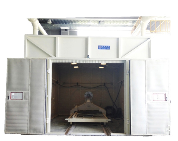 開(kāi)啟電源及照明→打開(kāi)雙開(kāi)門(mén)→電動(dòng)臺(tái)車(chē)將工件輸送至噴砂房?jī)?nèi),關(guān)閉大門(mén)→調(diào)節(jié)設(shè)備參數(shù)→自動(dòng)噴砂工作→噴砂和吹砂完畢打開(kāi)雙開(kāi)門(mén)臺(tái)車(chē)退出房體外→裝卸工件進(jìn)入下一循環(huán)工作.